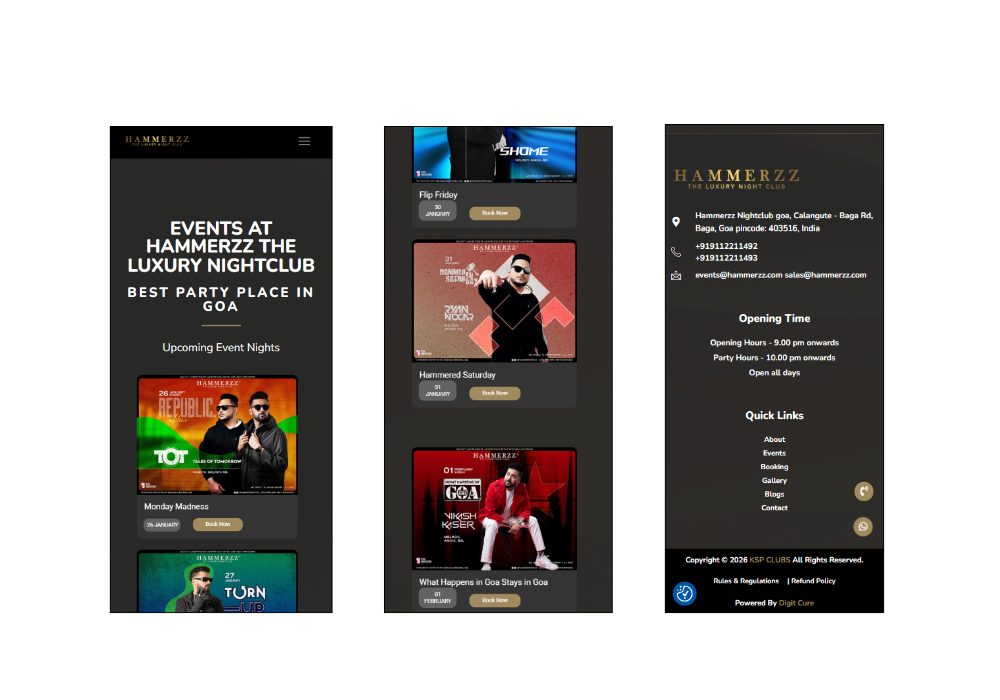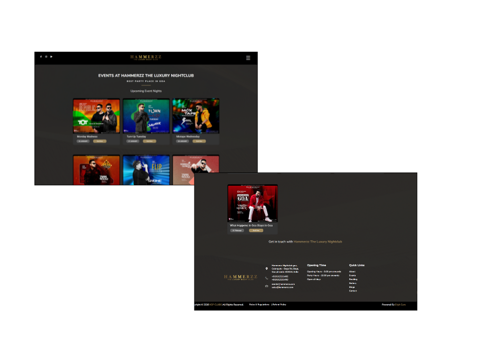 Hammerzz Nightclub, the leading luxury nightlife destination in Baga, needed a striking online presence that reflected its vibrant party atmosphere. We created a dynamic, visually engaging website featuring event calendars, DJ lineups, VIP table reservations, and immersive multimedia galleries. This platform effectively captures the electrifying essence of Hammerzz, boosting event attendance and establishing the venue as a must-visit nightlife experience in Goa.